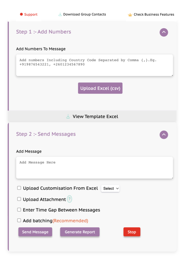 You can directly upload an excel sheet of numbers you want to send your message to without having to type or copy paste.